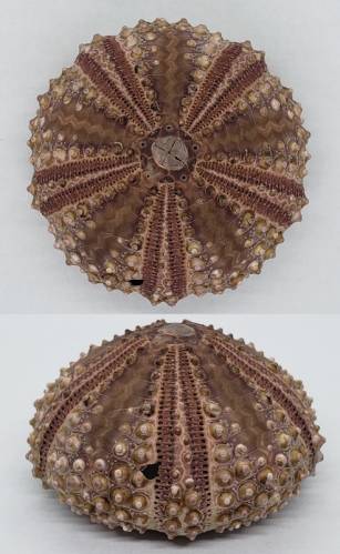 NoteOne very nice specimen of the very rare and hard to get (I usually obtain about 4-7 specimens per year) subtidal urchin Arbacia spatuligera. This species is naturally rare, and they live from 20 m up to about 200 m in northern Chile, however, most of them are obtained from about 35 to 70 m depth, in rocky outcrops. Apparently, there are two varieties for this species, and this one is from the rarer northern variety with coarser sculpture. This specimen was collected alive in prospective fisheries on northern Chile at 30-35 fathoms, and it is in very good condition for the species, having no damages or erosion to the shell. This is the test, denuded, of a normal-sized specimen; it was lightly cleaned with hand soap, but still can be cleaned further with some patience. These specimens are of a darker hue of brown (with some purplish when fresh) that other specimens which I have obtained which are paler. I only use soft brushes and hand soap to not alter the colors or texture of the shell. An interesting and very difficult-to-get Natural History Item from the southeastern Pacific at a very low initial price due to the tiny hole in the shell