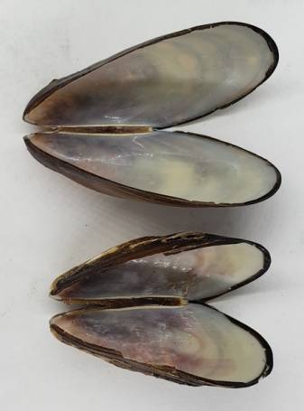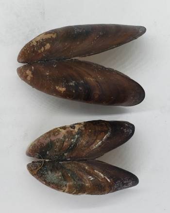 Two very nice specimens of the subtidal mytilid Semimytilus patagonicus. This species is seldom found in northern Chile, being apparently more abundant in southern Chile and Magellanic waters. These specimens are in excellent condition, with both valves with no damages and retaining its periostracum. A low initial price for an interesting bivalve from the southern seas.