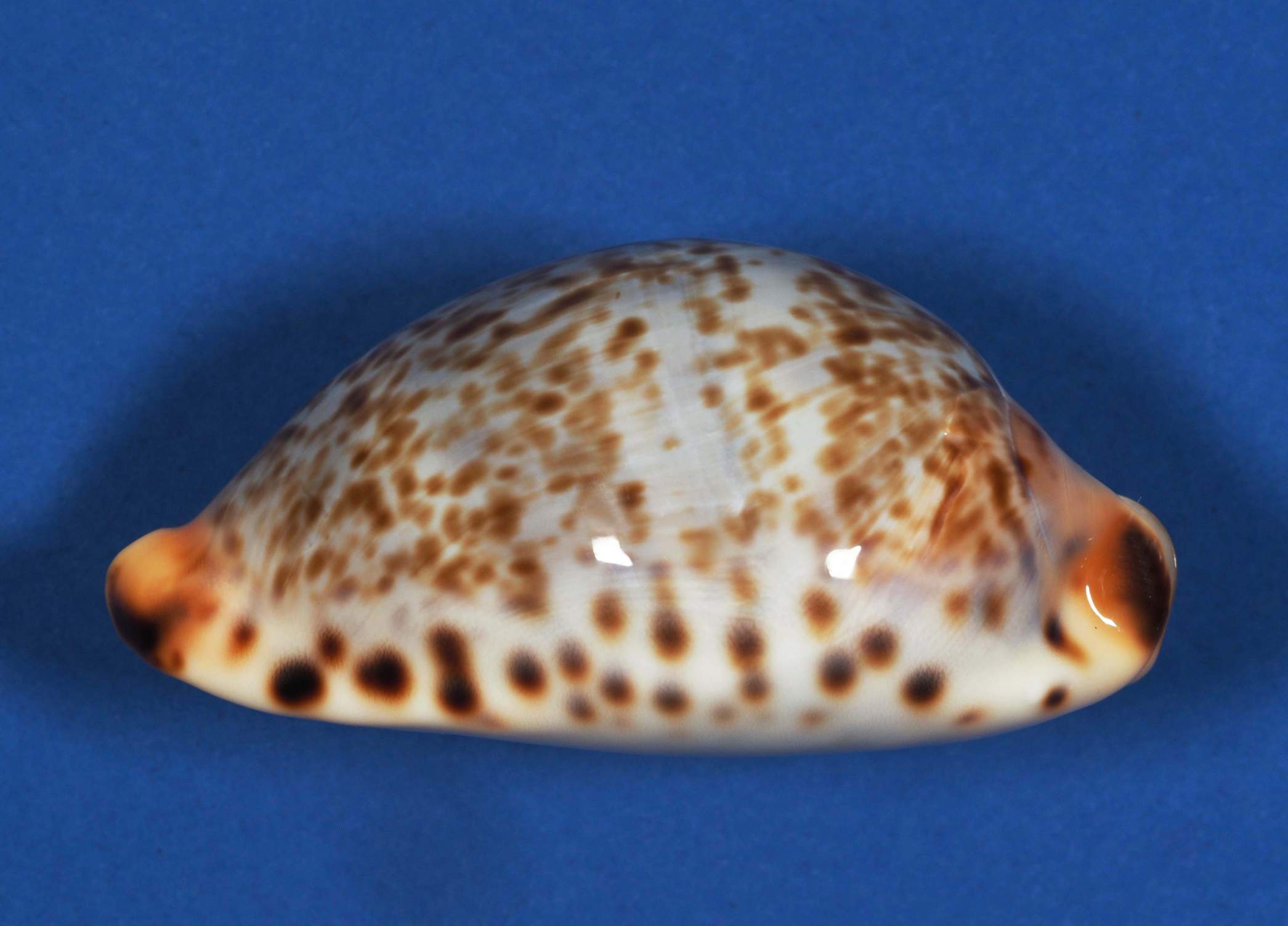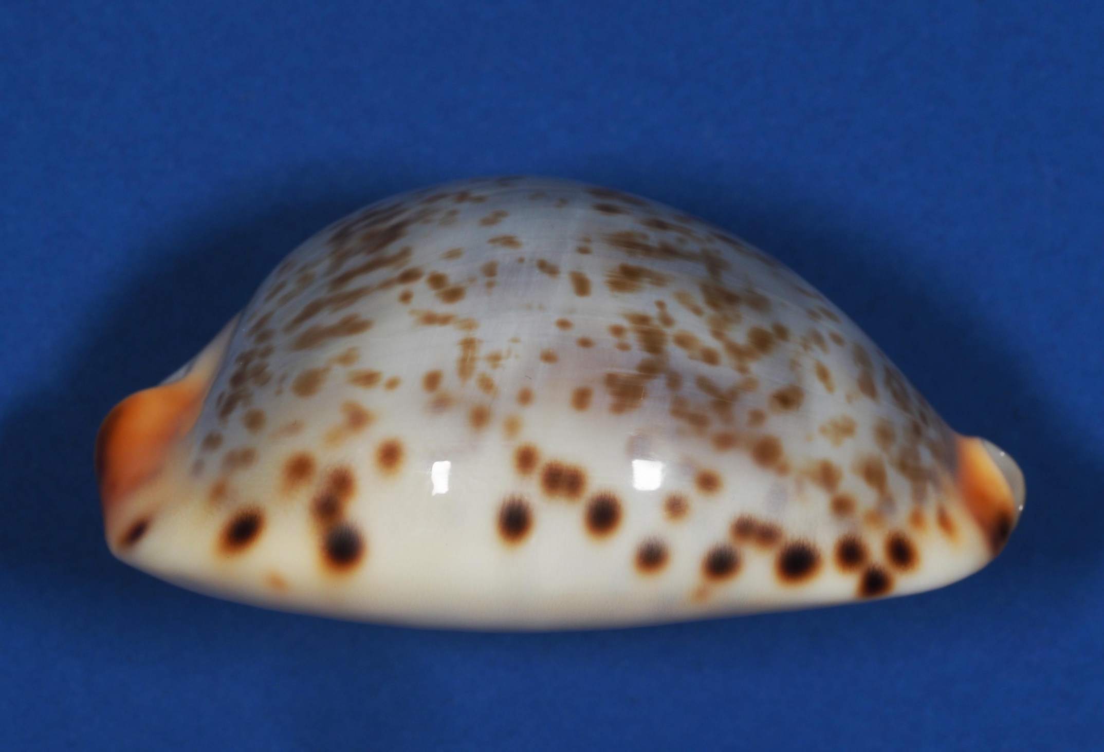 Classic lentigenosa with sparse fine tan spots on a grey/blue dorsum. It has a creamy apricot base and margins with intense black spots. Graded Fine++ as the columnar side is a little growthy. ROV collected from 96 metres of water south east of Augusta, Western Australia during October 2025. A very unique shell that we rarely come across.