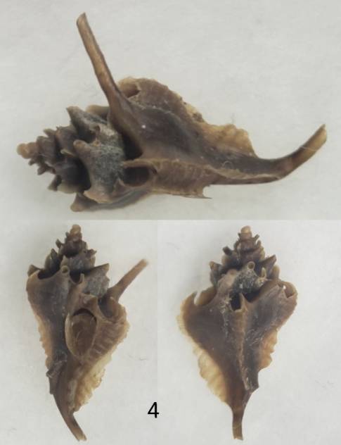 4. Exquisite high quality specimen with dark brown colour and very long siphonal channals. Dried animal and operculum inside. From Sapri, Italy