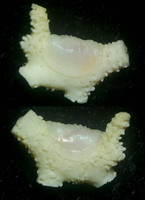 Lovely specimen of a female Pedicularia sicula (6 mm) attached to a piece (11 mm) of hoost hydrozoan Errina aspera. Tangled by fishermen at 120 m deep, Messina Strait, Italy. 1990's