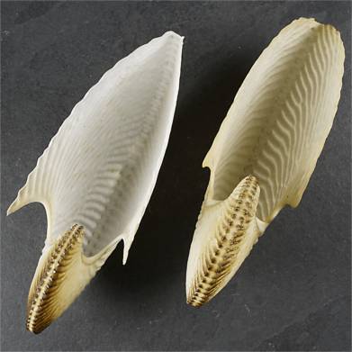 SELDOM SEEN YELLOW AND SPECKLED ARGONAUTA. A yellow Argonauta argo in excellent quality and of a rather big size. YELLOW ARGO are much fewer than white ones and much appreciated by collectors. Today, the yellow argo is a grand rarity. We add a large piece in white with a superb shape and an unusually speckled shell. The first time we see this phenomenon of yellowish spots "in" the shell. The periphery of the aperture has been smoothed in this white specimen. The yellow piece is not smoothed and as such it has a perfect natural shell. The chance of getting such a pair is zero. A unique opportunity.