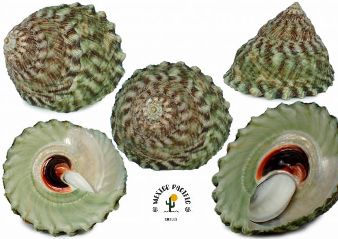 | Note | THE CRAZIEST DETAILED STRUCTURE SPIRE EVER WOOOOW!! Extremely clear detailed structure , sculpture and pattern spire you will see. Dense spotted pattern all around with dark brown colors and radiant green background color. Look at this spotted pattern going all around the spire combined with fresh dark green. Height 43mm high x 65.5mm wide!! The best extraordinary sculpture combined with pattern, size and extra darker dots all around with the vertical and undulated spiral ribs WOOOW!! Unique opportunity to get this unique rare species with great spire, lip, operculum, dark dots around, banded, green elegant fresh colors, very clear detailed structure and great large size. The single most striking feature is a brilliant spot of strong orange at the base of the umbilical pit which is bordered by a black outer edge, amazing!! this one here present a dense and dominant black color in the middle part and strong orange-reddish ringed color. I was looking for this species for years!! I know there are some small populations registered for Baja California Sur( La Paz + Pacific), Sinaloa (Mazatlán), Nayarit (Punta de Mita), Guerrero (Acapulco) and Oaxaca (Salina Cruz) But no In Jalisco State registered before, this is one of the first populations ever found in hundreds of kilometers of Coastline. In fact the population is only living between 50 square meters in a rocky beach, very small place, between 1 and 1.5m deep. Seldom seen in collections and for sure in the market with so fresh deep colors, awesome sculpture and impressive conditions. Natural insignificant imperfections as usual not really detracting the beauty like light erosion and micro scars of life. F+++-F++. For advancer collectors and lovers of special and rare species. Found attached on big stones about 1 to 2m deep Playa el Tecuan, Jalisco, Mexico. December 2025. Value for this really rare species endemic from Mexico with the most dense detailed spotted pattern, clear excellent sculpture and green colors : 80-95 euro. Good luck and Happy shelling!!! MEXICO PACIFIC. |