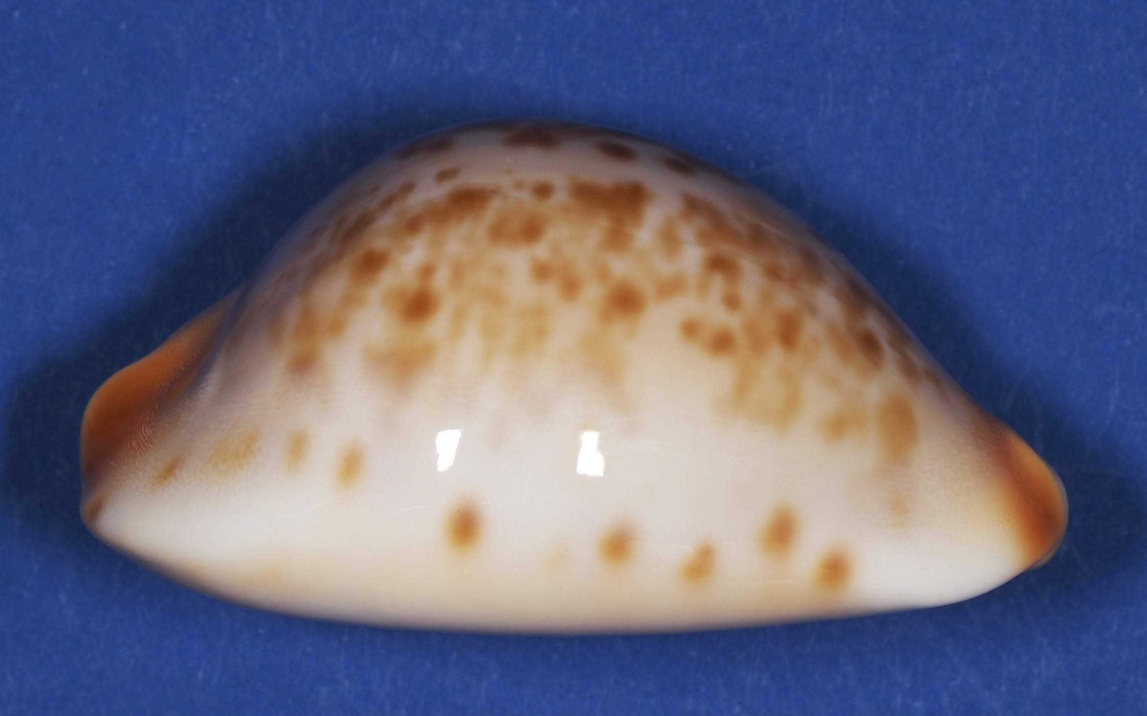 It is a narrow shell with very prominent siphons with tan spotted cream margins and a cream trimmed white base. Its dorsum is heavily spotted with course tan spots with an creamy wide mantle line. Graded Fine+/Fine++ as the posterior siphon has a healed chip and the dorsum has a hint of growth.