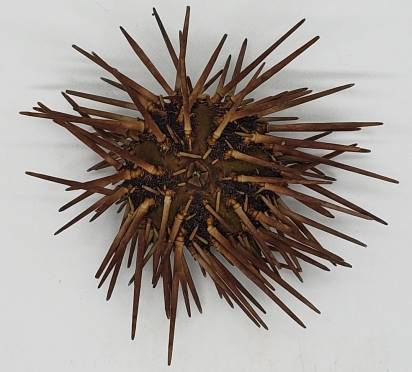 | Note | One very nice and rather small specimen (about 62 mm size with spines and about 25 mm size of the test) of the very rare and hard to get (I usually obtain about 4-7 specimens per year) subtidal urchin Arbacia spatuligera with spines. This species is naturally rare, and they live from 20 m up to about 200 m, however, most of them are obtained from about 35 to 70 m depth, in rocky outcrops. Apparently, there are two varieties for this species, and this one from the southern variety with weaker sculpture. This specimen was collected alive by divers from central Chile at 25 m depth, and it is in excellent condition for the species, having no damages or erosion to the shell and preserving all (or almost all) their spines. These specimens are of a darker hue of brown (with some purplish when fresh) that other specimens which I have obtained which are paler. These were lightly cleaned, but can be cleaned at perfection, and they were very carefully dried, preserving its aristotle lantern. An interesting and very difficult-to-get Natural History Item from the southeastern Pacific. |