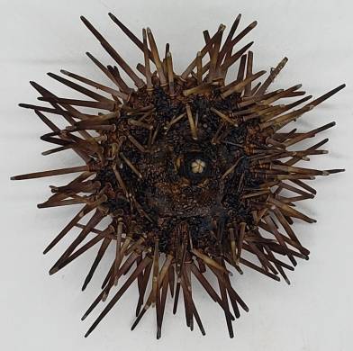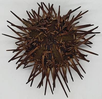 | Note | One very nice and rather small specimen (about 61 mm size with spines and about 28 mm size of the test) of the very rare and hard to get (I usually obtain about 4-7 specimens per year) subtidal urchin Arbacia spatuligera with spines. This species is naturally rare, and they live from 20 m up to about 200 m, however, most of them are obtained from about 35 to 70 m depth, in rocky outcrops. Apparently, there are two varieties for this species, and this one from the southern variety with weaker sculpture. This specimen was collected alive by divers from central Chile at 25 m depth, and it is in excellent condition for the species, having no damages or erosion to the shell and preserving all (or almost all) their spines. These specimens are of a darker hue of brown (with some purplish when fresh) that other specimens which I have obtained which are paler. These were lightly cleaned, but can be cleaned at perfection, and they were very carefully dried, preserving its aristotle lantern. An interesting and very difficult-to-get Natural History Item from the southeastern Pacific. |