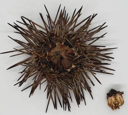 | Note | One very nice and medium-sized specimen (about 88 mm size with spines and about 36 mm size of the test) of the very rare and hard to get (I usually obtain about 4-7 specimens per year) subtidal urchin Arbacia spatuligera with spines. This species is naturally rare, and they live from 20 m up to about 200 m, however, most of them are obtained from about 35 to 70 m depth, in rocky outcrops. Apparently, there are two varieties for this species, and this one from the southern variety with weaker sculpture. This specimen was collected alive by divers from central Chile at 25 m depth, and it is in excellent condition for the species, having no damages or erosion to the shell and preserving all (or almost all) their spines. These specimens are of a darker hue of brown (with some purplish when fresh) that other specimens which I have obtained which are paler. These were lightly cleaned, but can be cleaned at perfection, and they were very carefully dried, preserving its aristotle lantern. An interesting and very difficult-to-get Natural History Item from the southeastern Pacific. |