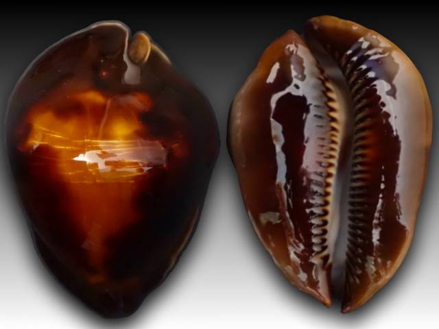 Appealing radically humped specimen of this desirable and treasured Australian Zoila classic. Marvelous wide form with modestly flanging tuberculated margins and superior black/brown/pastel and burnt orange/dark brown/black fused dorsal coloration. The shell exhibits a thick glossy nacre on a flawless dorsum with a chocolate brown window without a ivory white patch. The shell has thick anterior and posterior flanges, perfect margins, extremities and strong weight/size ratio (34.0 grams).Taken by diver Andrew Edinger off Bernier Island, Carnarvon, Western Australia at 44 meters while sitting on a purple sponge back in 7/2006. The shell has two labral hard to notice glazed micro-inclusions on both extremities.The shell includes Andrew's hand written data tag. Grade: F+++/GEM minus.