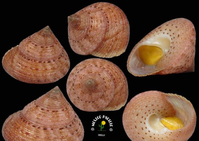 | Note | CALLIOSTOMATIDAE - Calliostoma aequisculptum (Carpenter, 1865). RARE!! With 15.5mm high and 19mm wide. DARK PINK VIVID COLORATION WOOOOW!! Special banded micro dark brown multiple spots all around the spire. Extraordinary dense multiple knobs-micro spines all around with the best dark pink color, beautiful lip, intact apex, spire and sculpture. Stunning pearly aperture and spiral diamond-shaped ribs in the form of spiny knobs. Micro multiple diamonds forms all around. Do not miss this spectacular beauty. F+++. Found attached under dead large corals pieces about 4m deep. Cuastecomates, Jalisco, Mexico. January 2026. Value for this uncommon dark pink dominant color and multiple micro dense spiny knobs details all around: 20-25 euro. Good luck and happy shelling. MEXICO PACIFIC |
