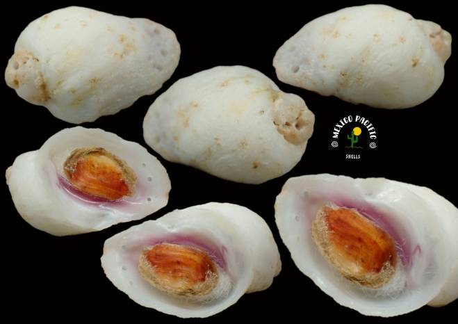 | Note | ELEGANT PURPLE INNER LIP COLOR FORM!! This species are most hidden between live corals for protection but some of them when the corals grow fast, sometimes they get trapped and die inside the coral. This species is never Gem, here a really nice aperture with dark purple inner lip color and original seldom seen operculum. Great elongated form, some erosion and drill holes around as usual for the species. See pictures. Found attached inside dead corals about 5-6m deep. Cuastecomates, Jalisco, Mexico. January 2026. Value for this seldom seen species with rare original operculum: 20-25 euros . Good luck and happy shelling. MEXICO PACIFIC |