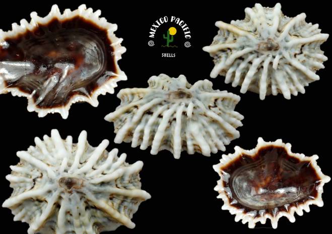 | Note | SPECIAL AND EXCEPTIONAL SEVERAL FINGERS WOOOOOW!! SIPHONARIIDAE - Siphonaria palmata (Carpenter, 1857). Gem. The most elegant and intact fingers. Impressive dorsal unique side with the best axial ribs and unique pattern. Look at this Black marvelous glossy masterpiece ventral side with white outline lip fingers. So fresh gloss ventral black dark-brownish colors. Incredibly beautiful piece with a special light flat shape and unique sculpture. White long axial elegant ribs forming the extended seldom seen fingers. A very interesting species that in many cases remains in the same place all its life, forming together with the erosion on the stone the exacted figure of the shell outline. Exceptional conditions for the species the best!! F+++-Gem. Apparently feeding on the marine soup that comes and goes with the currents, waves and seaweeds, this species lives where the waves break and in the intertidal zone. Really hard to remove from stones without braking them. Found attached to the rocks with green and brown algae at extremely low tide. Islotes los Lobos Marinos, near Melaque, Jalisco, Mexico. March 2026. Value for this glossy black-brown ventral side with excellent long white ring fingers and intact dorsal spectacular ribs conditions: 15-18 euro. Good luck and Happy shelling!!! MEXICO PACIFIC |