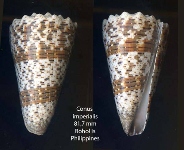 | Item | # 0004097236 | | Family | Conidae | | Name | Conus imperialis - NICE PATTERN , Linnaeus, 1758 |