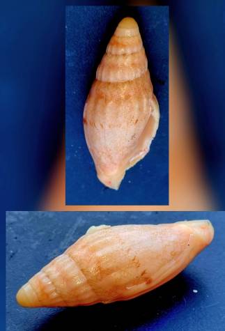 F+ Collected in moderate deep water by a cray fisherman off Gerakton WA this Recently described Notovoluta stricklandi is on offer. It's a crabbed shell and has a nasty lip/tail break but displays ok from dorsal and side shots. But probably first of this named species on offer to shell auction.
